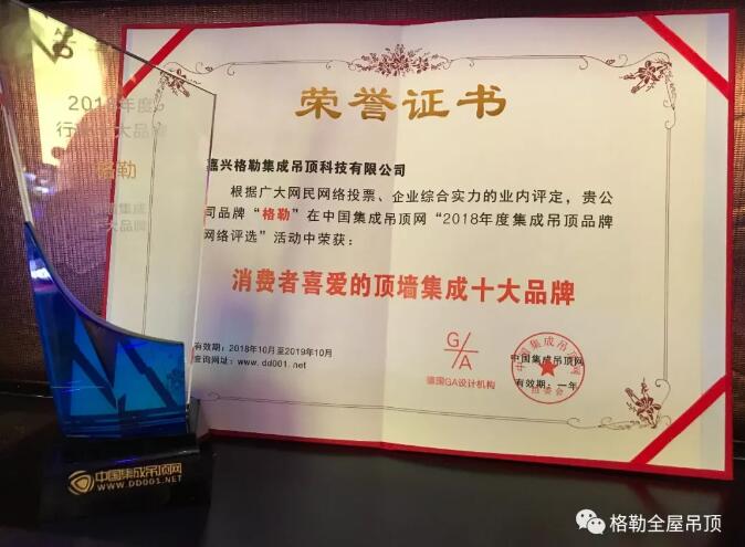 恭喜格勒荣获“消费者喜爱的顶墙集成十大品牌”,为格勒的荣誉加冕,为您的支持点赞!